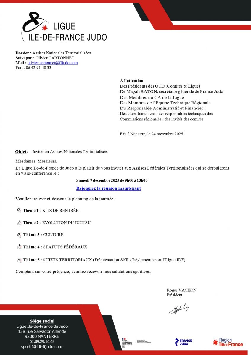 La Ligue Île-de-France de Judo a le plaisir de vous convier aux Assises Fédérales Territorialisées qui se tiendront le dimanche 7 décembre 2025 en Visio, de 9h00 à 13h00, en visioconférence.