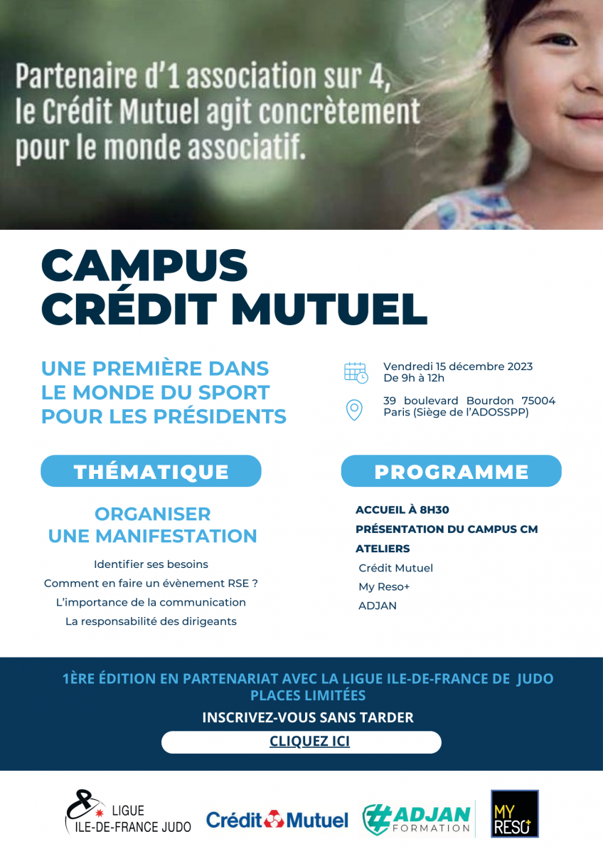 Le Crédit Mutuel en partenariat avec la Ligue Ile-de-France de judo vous invite le vendredi 15 décembre pour le PREMIER CAMPUS CM à destination des clubs de judo franciliens.