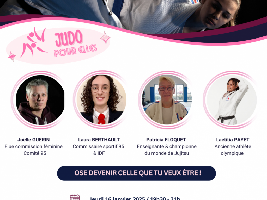 Rejoignez le mouvement "Judo Pour Elles" et participez à un entraînement de masse dédié à la "Découverte du Ju-Jitsu pour les féminines". Cet événement, encadré par Patricia FLOQUET, est ouvert aux benjamines et plus, avec la présence exceptionnelle de nos ambassadrices.